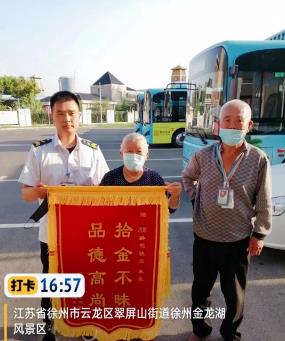 9月5日下午,兩位老人將一面印有“拾金不昧 品德高尚”的錦旗送到208路線駕駛員朱亮手中。